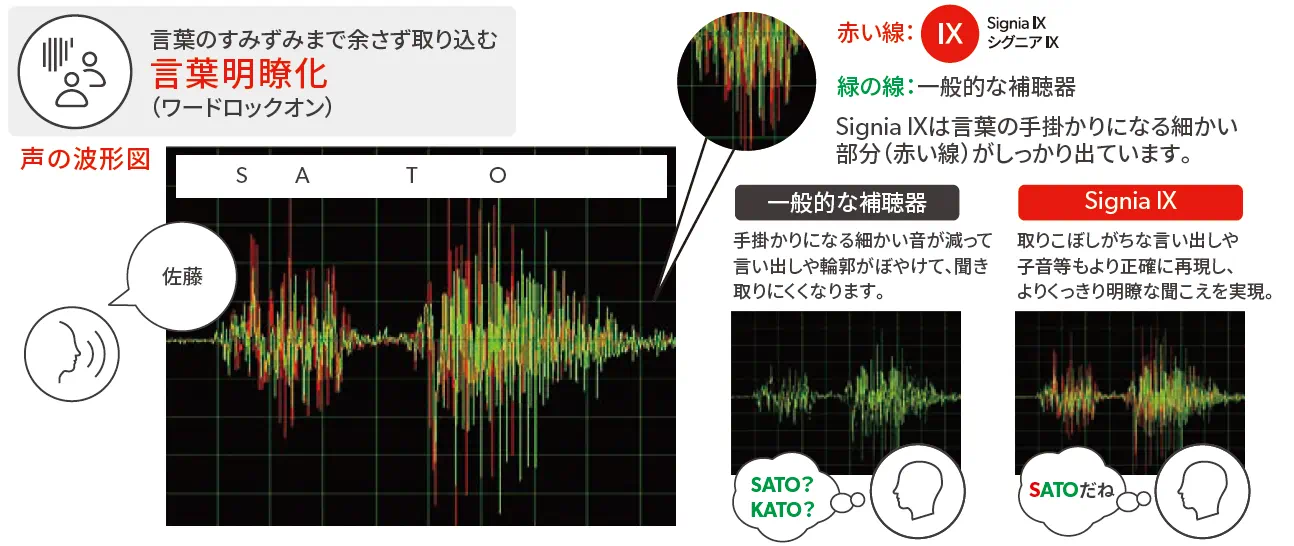 Insio IXの2器種はシグニアの最新音声技術「Signia IX」を搭載しています。ワードロックオン機能は、一般的な補聴器が取りこぼしがちな、言葉の言い出しや子音も余さず取り込み、それをすみずみまで正確に再現することで、よりくっきりとした明瞭な聞こえを実現します。