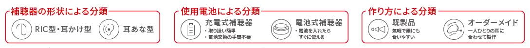 補聴器には色々な種類がありますが、分類方法も様々です。形状で分ける場合、使用している電池の種類で分ける場合、作り方によって分ける場合、とあります。