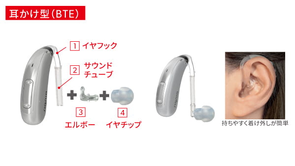 耳かけ型補聴器はもっと細分化すると、「RIC型」と普通の「耳かけ型(BTE)」に分けることができます。