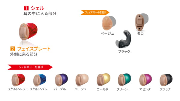耳あな型補聴器のカラーバリエーションも、耳かけ型に負けていません。耳の中に入る部分(シェル)は、多くの色から選択できる器種がほとんどです。左右区別しやすいように別の色にしてみたり、自分が好きな色にしてみたりと、楽しんで選ぶことができます。外から見える部分(フェイスプレート)のカラーは、目立ちにくさの観点からベージュ、モカ、ブラックがあります。