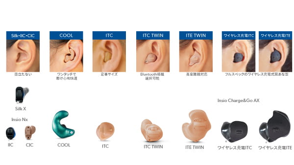 耳あな型補聴器は、耳あなにスッポリ収まる小型のものから、耳の外から見える大型のものまで、いくつかのタイプがあります。