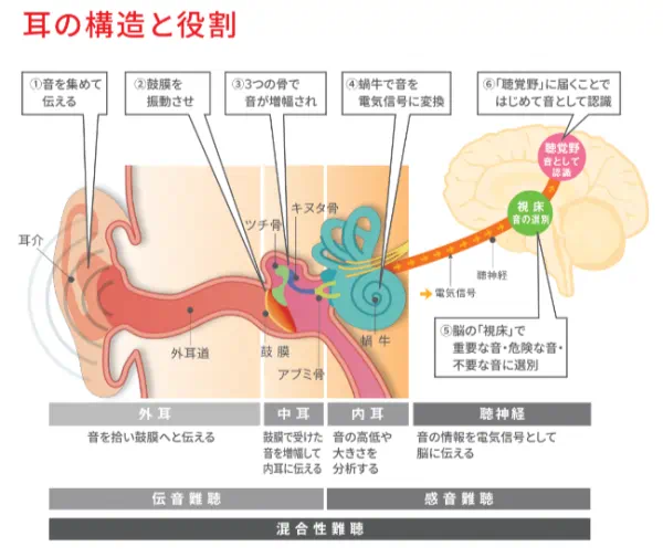 私たちの耳の中には「有毛細胞」と呼ばれる、音を感知して脳に伝える役割をもつ細胞があります。この有毛細胞は、耳の奥にある「蝸牛(かぎゅう)」という器官の中に整然と並んでいます。音が耳に入ると、この細胞がその刺激をキャッチし、脳へと信号を送ることで、私たちは「音が聞こえる」と認識できるのです。