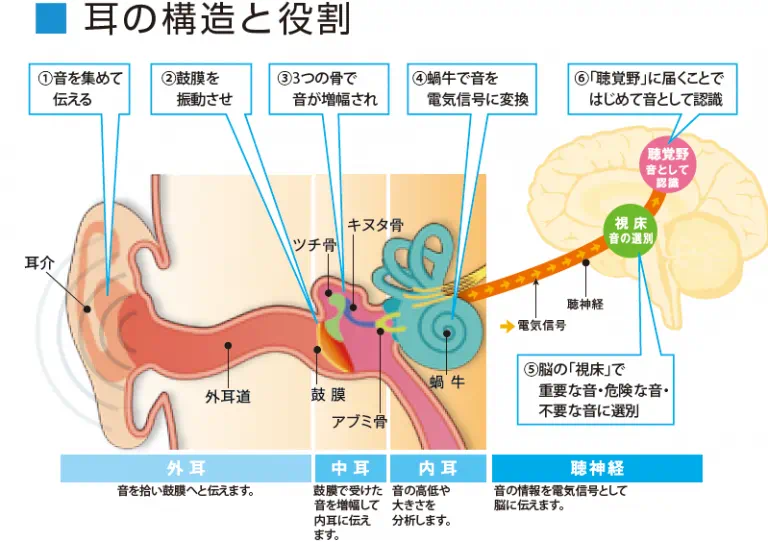 人間の場合、音は耳の穴から入り、鼓膜を振動させます。その振動は「内耳」と呼ばれる部分で感知され、聴力が得られます。