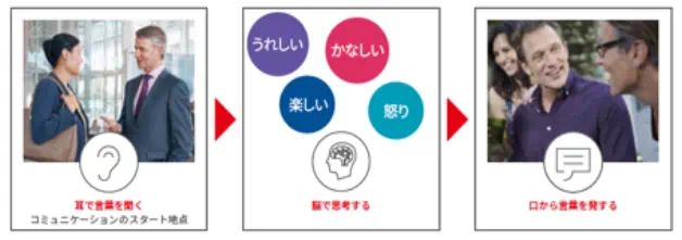 会話でのコミュニケーションは、当たり前ですが「耳で言葉を聞き取る」ことから始まります。耳で言葉を聞いて、脳で思考し、言葉で返す、というのが会話をするときの処理プロセスです。